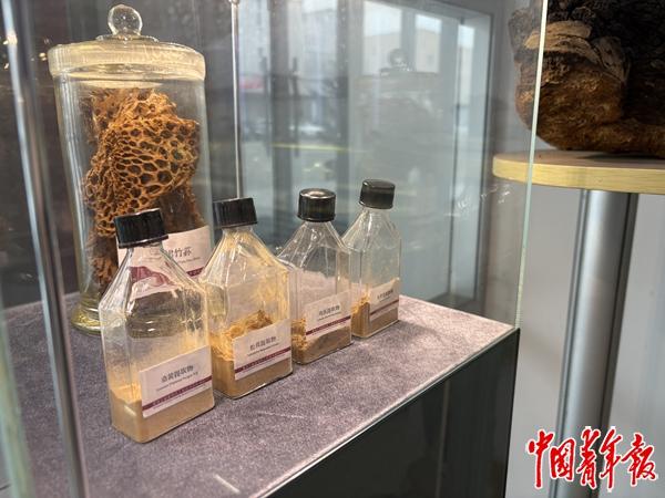 中科优术(黑龙江)科技产业有限公司一楼展厅,陈列出该公司研发的松茸提取物、白灵菇提取物等产品。中青报·中青网见习记者 杨雷 摄