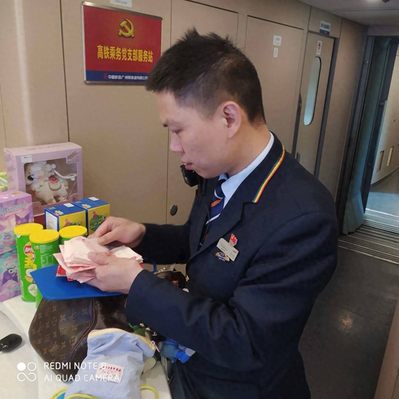 刘江鸿没有丝毫犹豫,第一时间将手提包移交给了党员列车长王浩。为了明确包内物品、便于寻找失主,王浩与刘江鸿在餐车共同打开执法记录仪,对包内物品进行清点。经仔细核对,包内有一台平板电脑、厚厚一沓现金共计6702元人民币,以及各类银行卡、证件12张。面对这笔数额不小的财物,王浩心里只有一个念头:旅客一定急坏了!